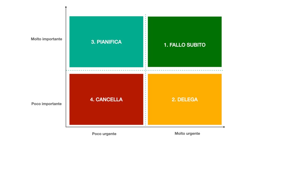 Se nella frenesia del quotidiano confondere l’importante con l’urgente è comune, fermarsi a riflettere per capire come agire rispetto a determinate situazioni è fondamentale. Oltretutto Eisenhower era solito dire che “ciò che è importante è raramente urgente e ciò che è urgente è raramente importante”, se questo dovesse essere vero allora qua sotto dovremmo trovare ottime soluzioni per la nostra vita lavorativa e non solo.